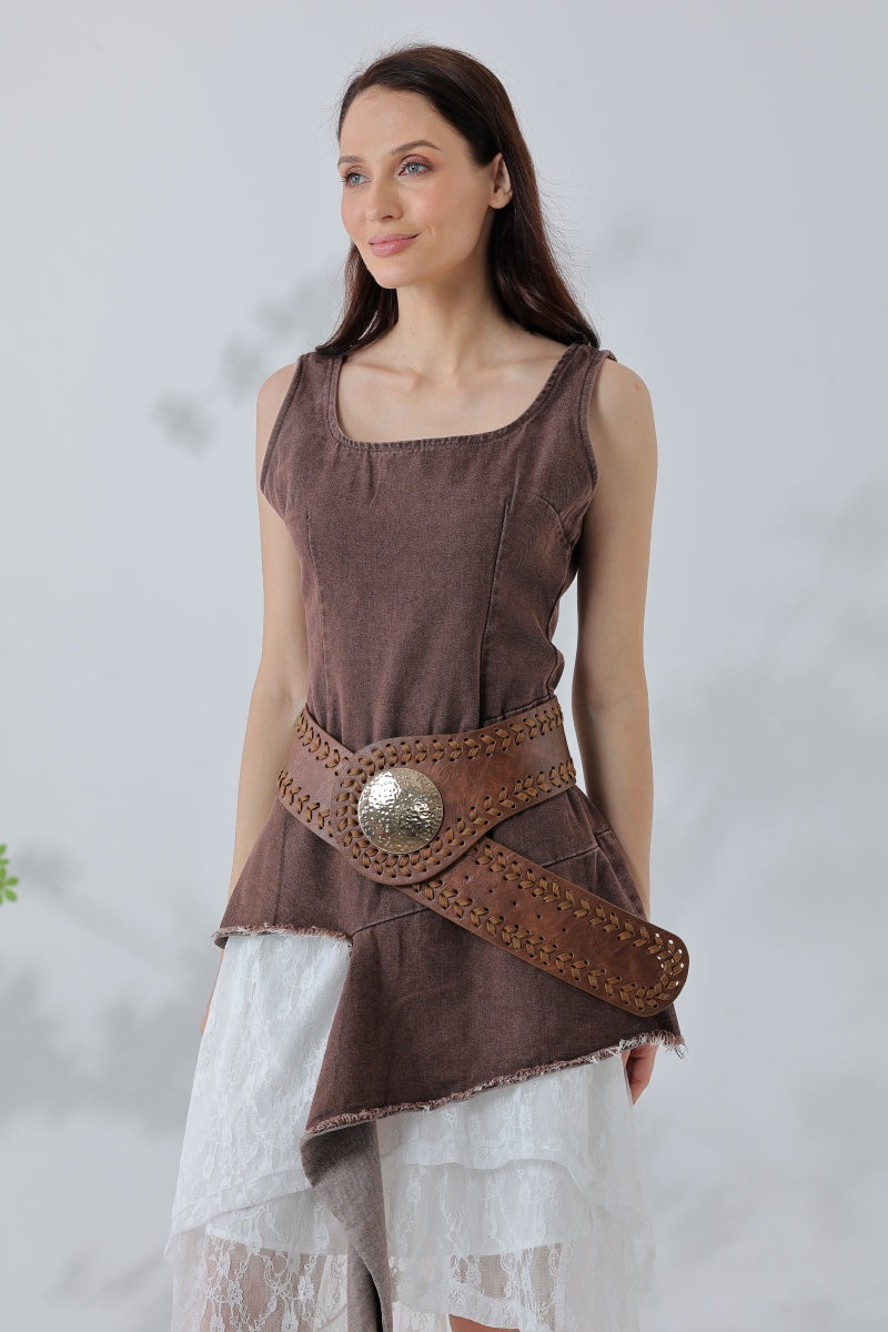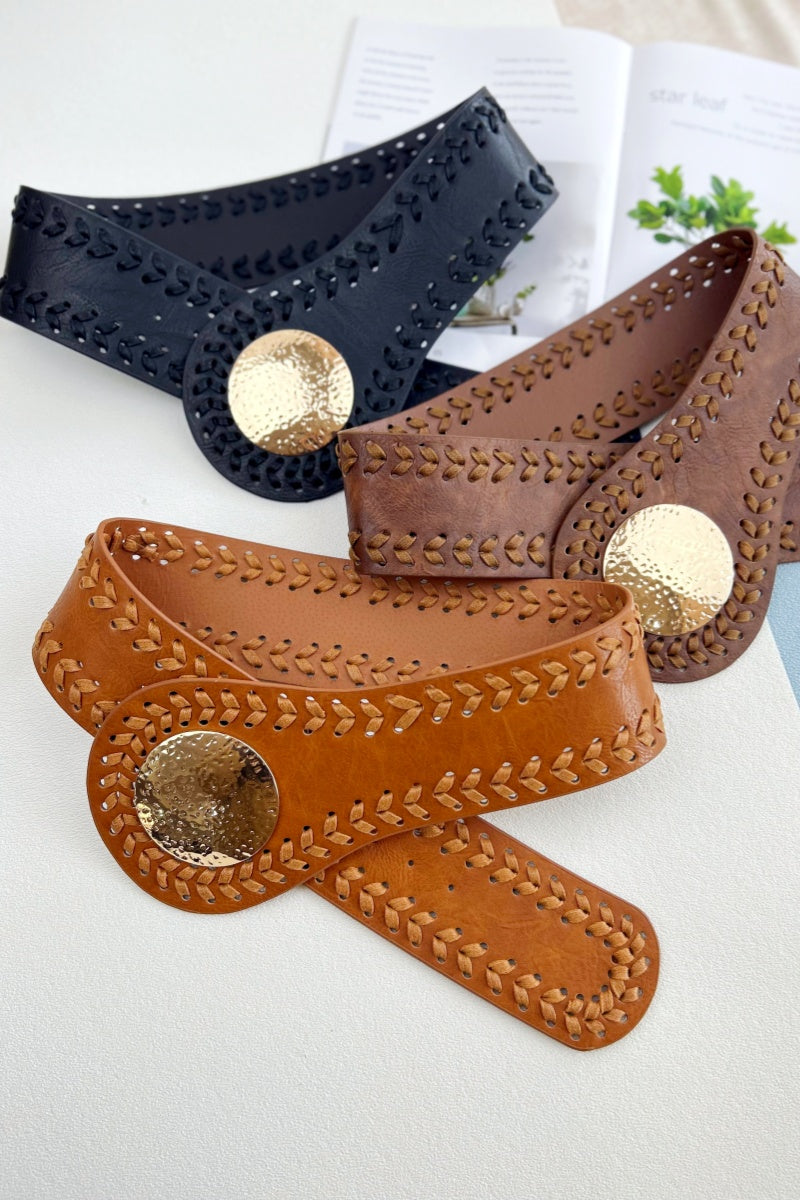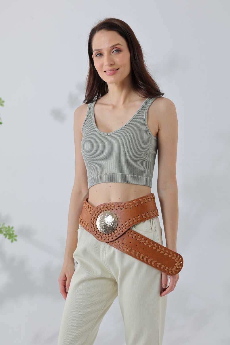 Artisan Soul: Boho Whipstitch Wide Leather Belt with Hammered Gold Buckle