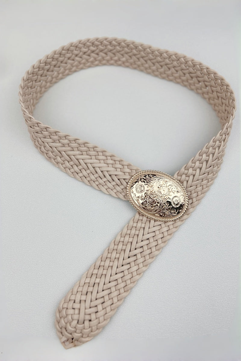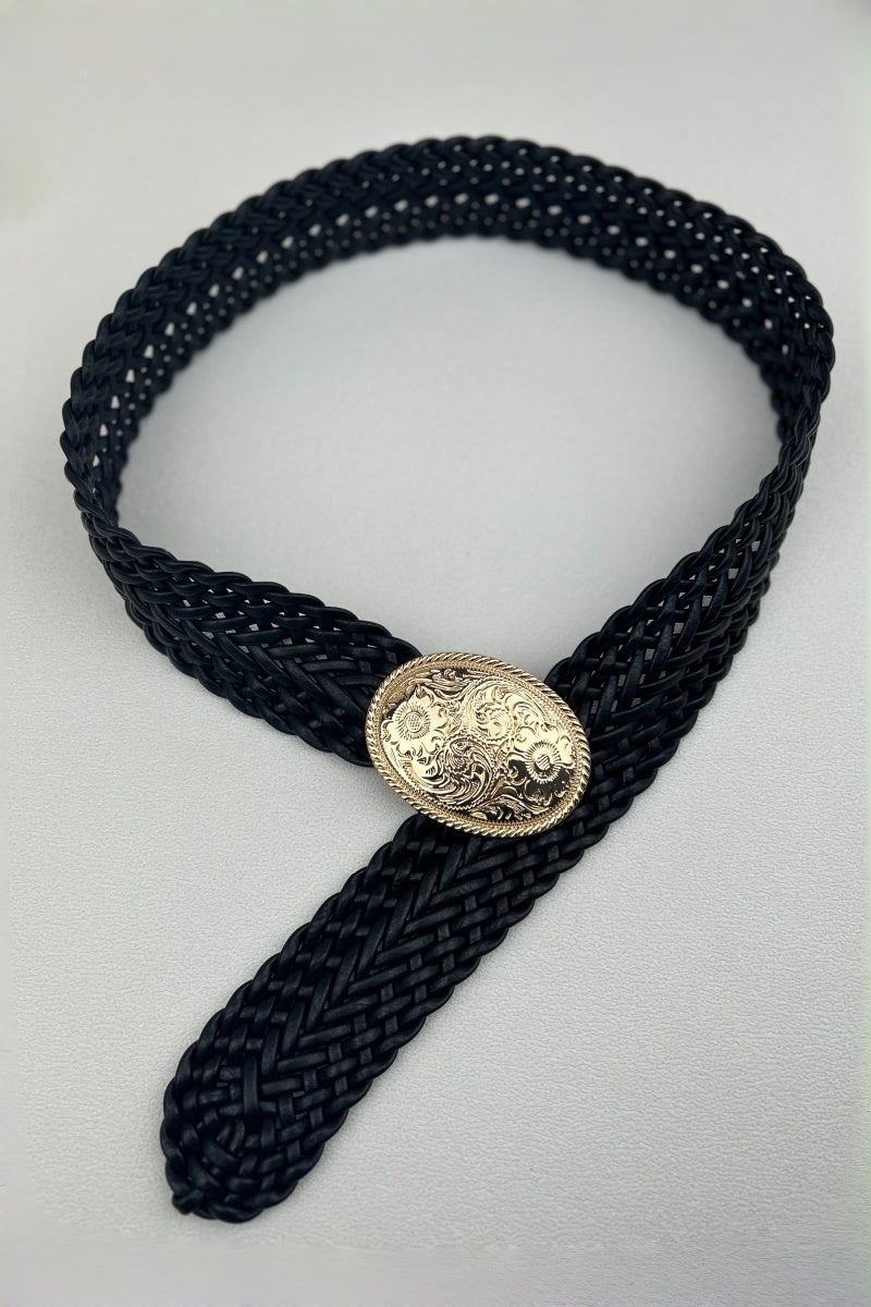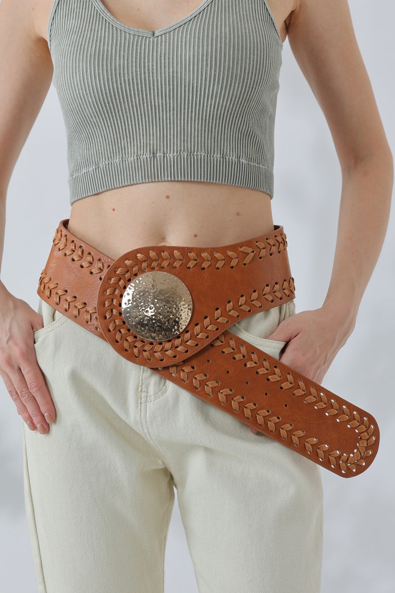 Golden Nomad: Bohemian Woven Wide Belt with Gold Engraved Medallion