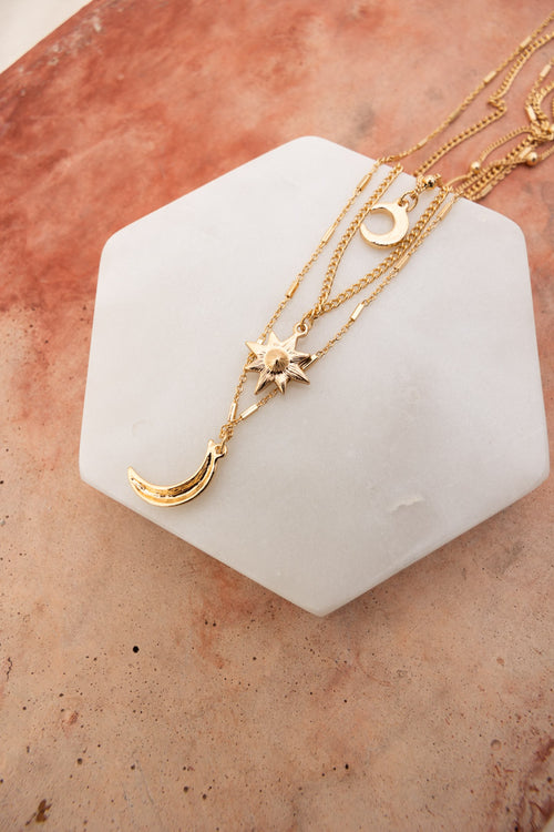 This celestial layered necklace features delicate moon and star charms, perfect for adding a touch of whimsy and sparkle to any outfit. With a fun and happy tone, this necklace is sure to bring joy to any outfit or occasion. #lovemyleto