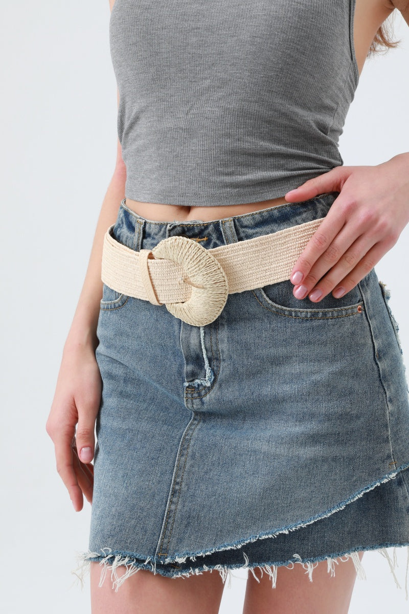 Artisan Raffia Elastic Belt with Crescent Moon Buckle